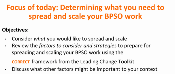 Susan Mcneill教授就各中心如何推广传播BPSO工作进行发言,首先,她指出我们需要明确要传播和推广的是什么;其次,她总述了在推广BPSO的工作时需要考虑的因素,介绍了Leading Change Toolkit工具书和“CORRECT”传播框架,并讨论了其他对变革环境可能很重要的因素。Doris Grinspun教授同时指出,变革是非常必要的,但变革也需要科学严谨的方法的指导,运用组织的内驱力和各项资源才能实施最后的变革,实现进步与提升。